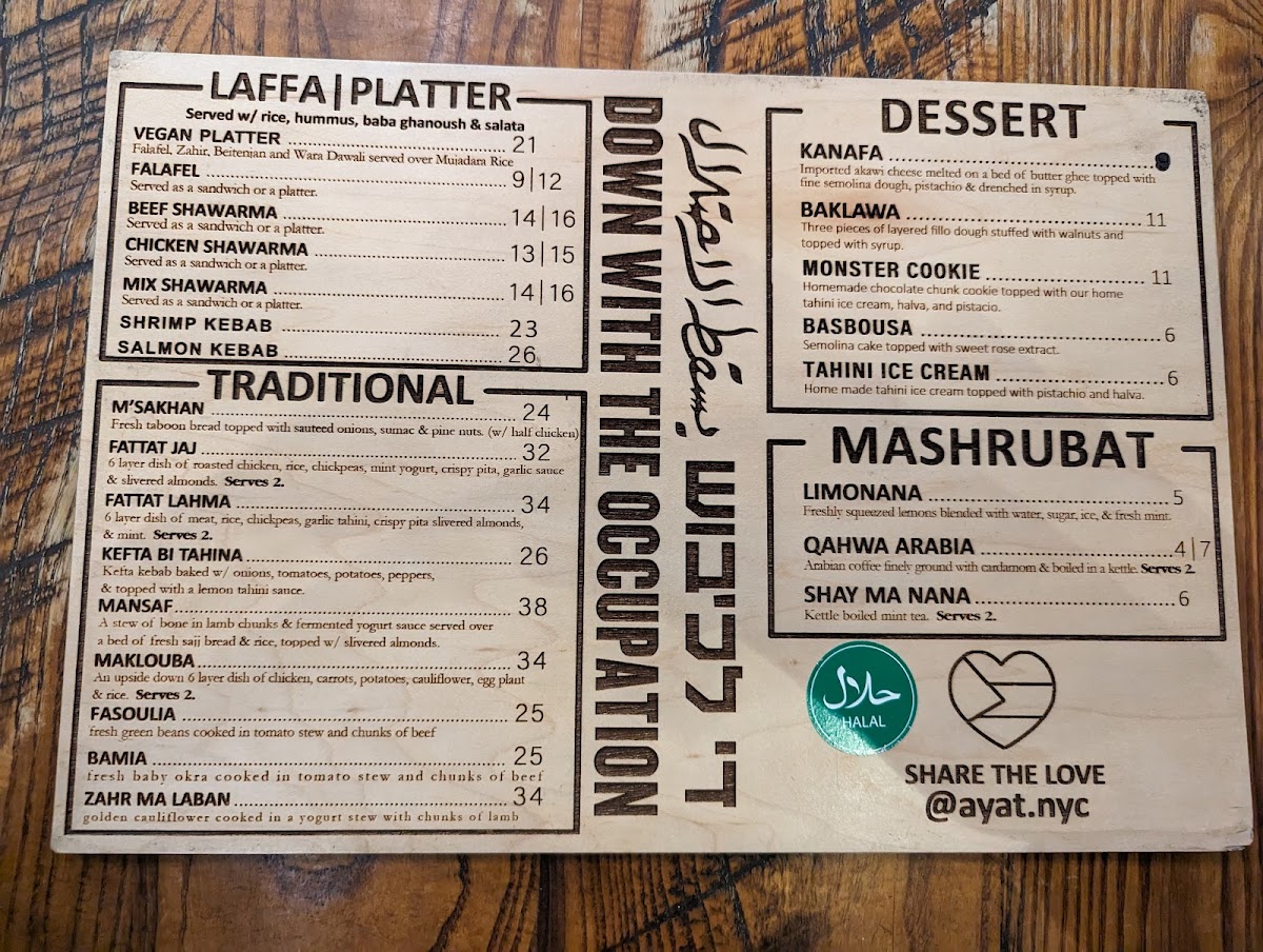 Ayat Bay Ridge offers an authentic Palestinian dining experience right in the heart of Brooklyn. The menu beautifully balances traditional Middle Eastern flavors with options that cater to vegetarian, gluten-free, and halal diets. Highlights include the Araby Mix Shawarma, a savory blend that bursts with aromatic spices, and the irresistibly fresh Falafel, crisp on the outside and tender inside. The Kibbeh, stuffed with seasoned beef and bulgur, showcases the artistry of Palestinian cuisine.